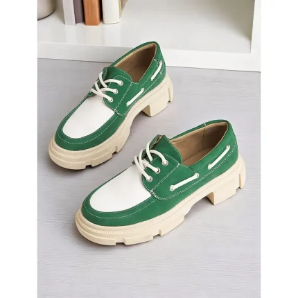 Women’s Oxford Style Platform Shoes – Trendy Green and White Color Block with Chunky Sole, Ideal for Commuter Wear and Casual Office Days