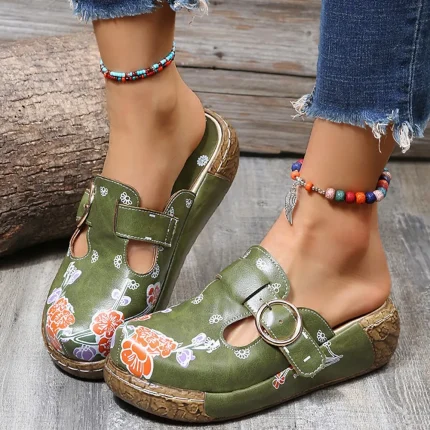 Women’s Floral Embroidered Slip-On Clogs with Buckle Detail and Wedge Heel – Comfortable Vintage Casual Shoes