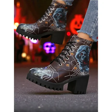 Women’s Halloween Skull Spider Web Gothic Ankle Boots – Chunky Heel Lace-Up Faux Leather Shoes for Spooky Parties and Cosplay