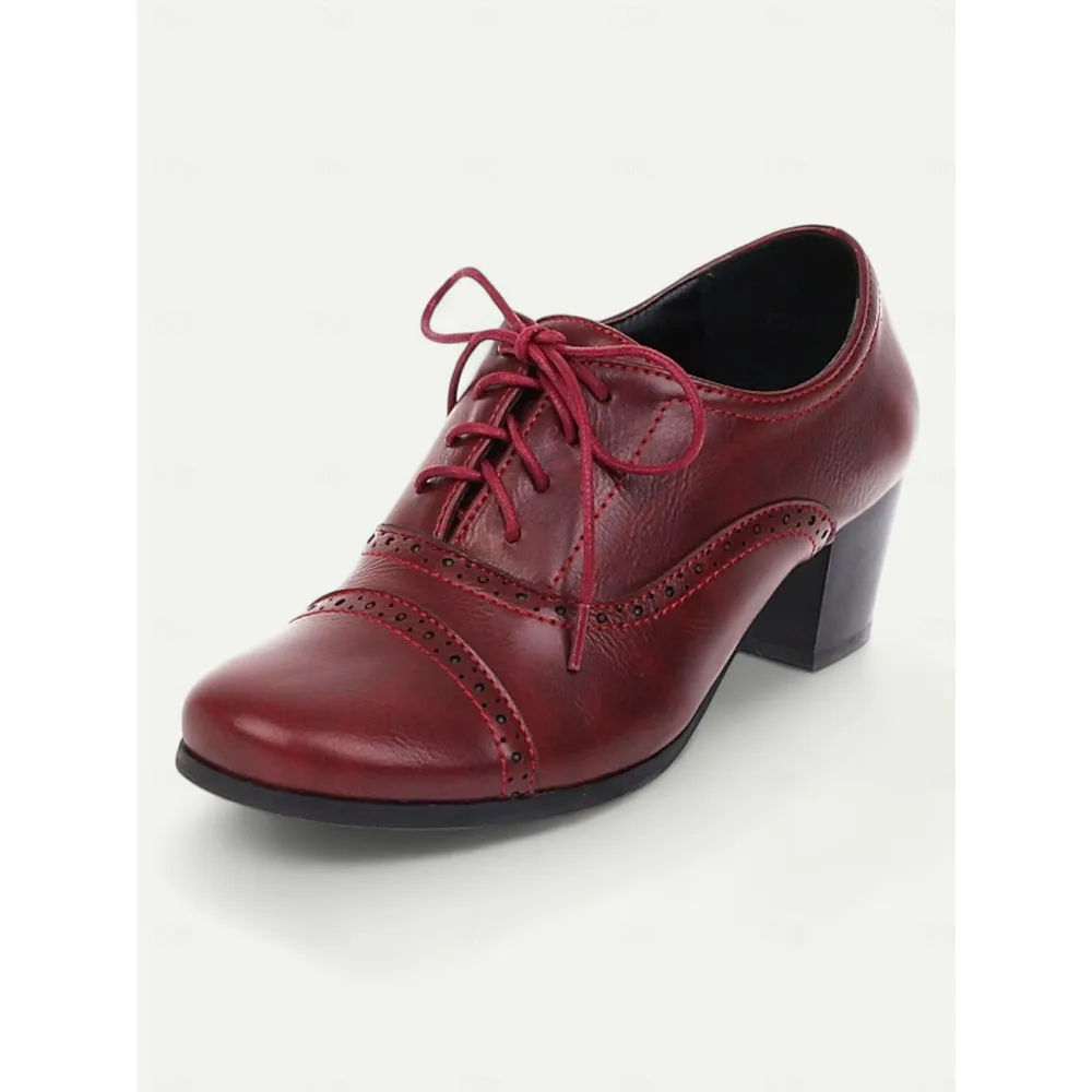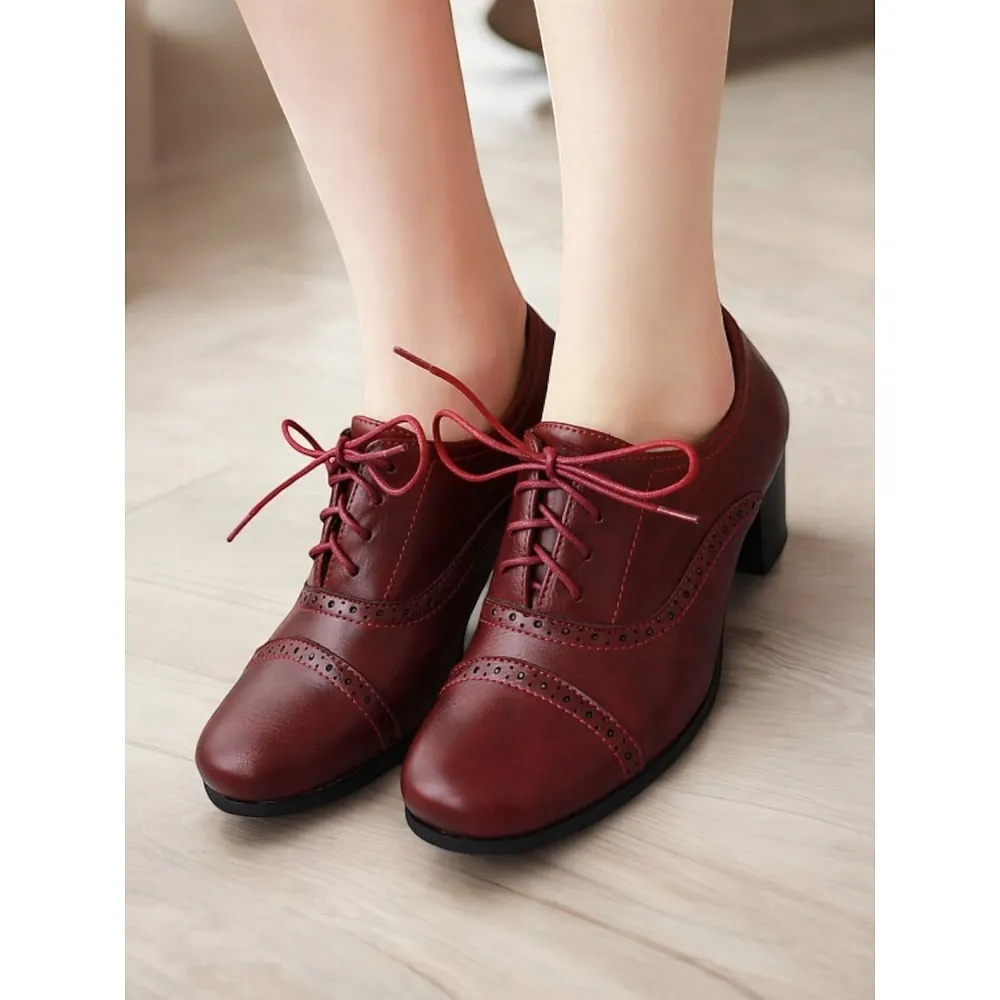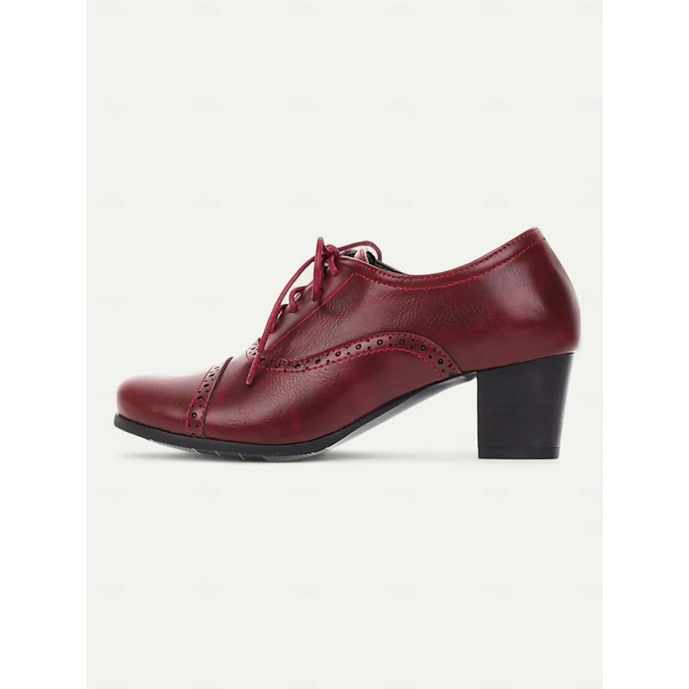 [Fabric]: Crafted from premium PU with synthetic leather lining, these women’s oxford shoes are designed to offer both durability and comfort. The smooth PU upper is accentuated by intricate brogue detailing, adding a touch of classic elegance to the overall design. The rich dark red color further enhances their stylish appeal.[Shape]: Featuring a closed lace-up system, these oxfords offer a secure fit that perfectly combines vintage charm with modern comfort. The medium block heel is designed to provide stability and support, ensuring they are comfortable for all-day wear.[Design Highlights]: These shoes are distinguished by their stunning brogue detailing around the toe cap and sides, which adds sophistication and a retro vibe. The round toe shape and decorative lace-up closure enhance their versatile look, making them suitable for various styles and occasions.[Occasions]: Perfect for daily wear, work environments, and vintage-themed events. Their elegant design makes them an ideal choice for both professional settings and casual outings, seamlessly transitioning from office hours to evening gatherings.[Size]: Available in sizes ranging from US5.5 to US10.5, these shoes maintain a standard fit. It is recommended to choose your usual size for the best fit, ensuring comfort and style for various foot sizes.OK