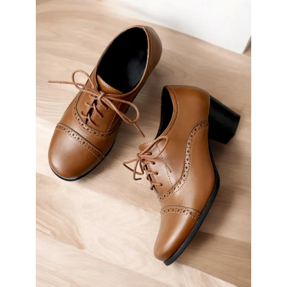 Women’s Brown Oxford Shoes with Lace-Up & Brogue Detailing – Classic Mid-Heel for Professional & Vintage Casual Wear