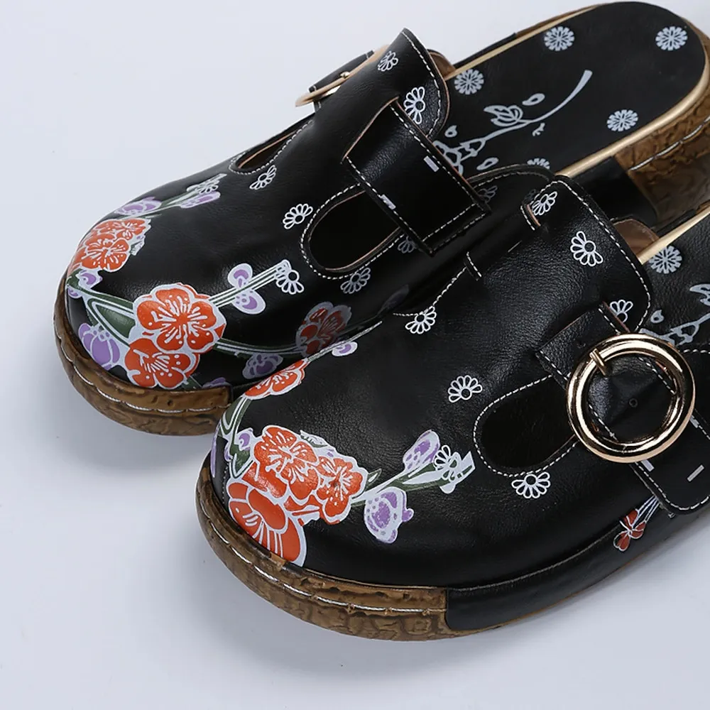 Women’s Floral Embroidered Slip-On Clogs with Buckle Detail and Wedge Heel – Comfortable Vintage Casual Shoes