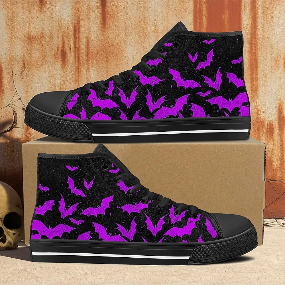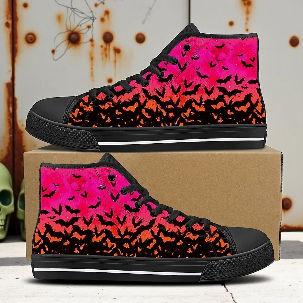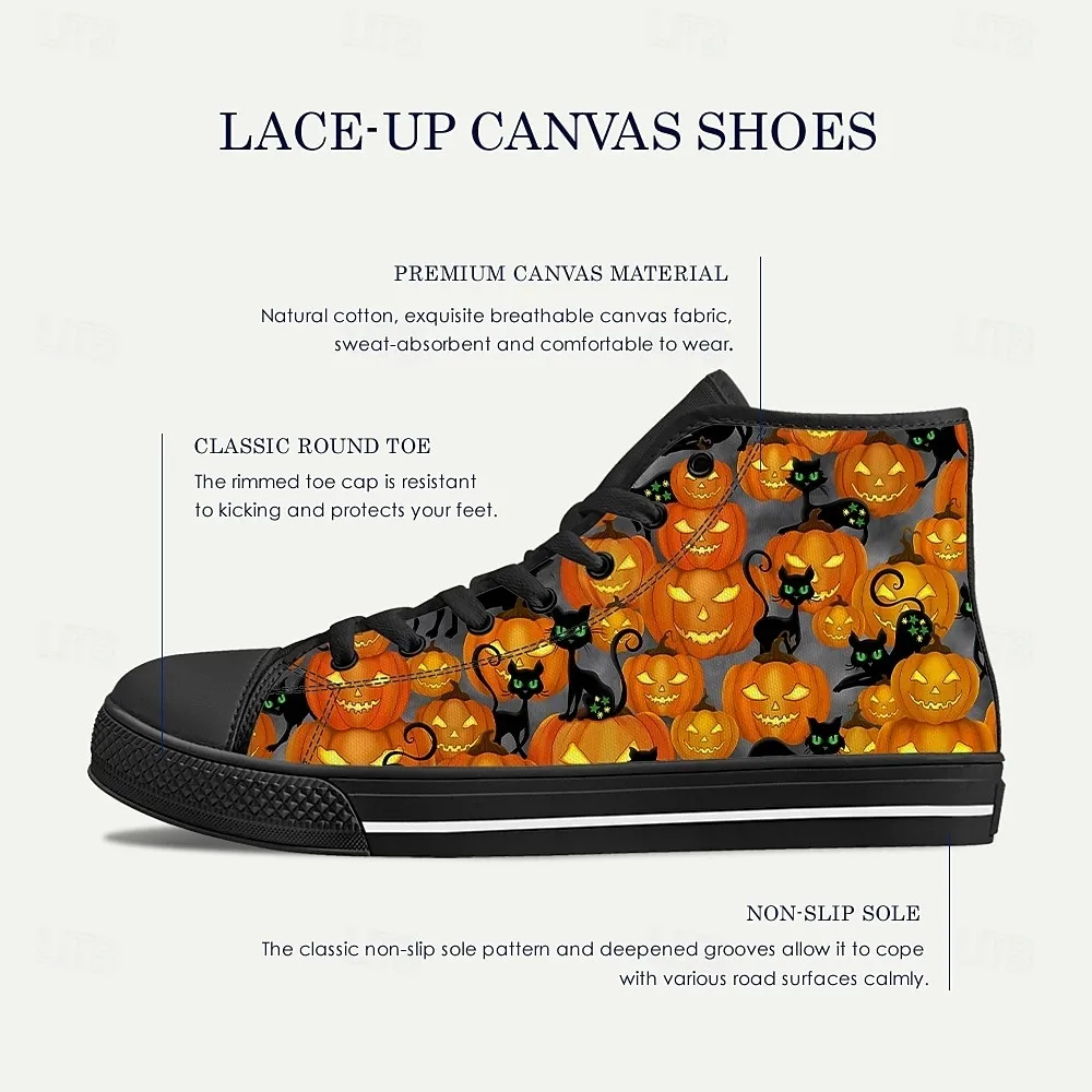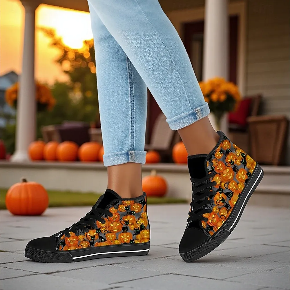 Women’s High Top Canvas Sneakers with Cat and Pumpkin Print – Gothic Halloween Party Shoes for Walking and Casual Wear
