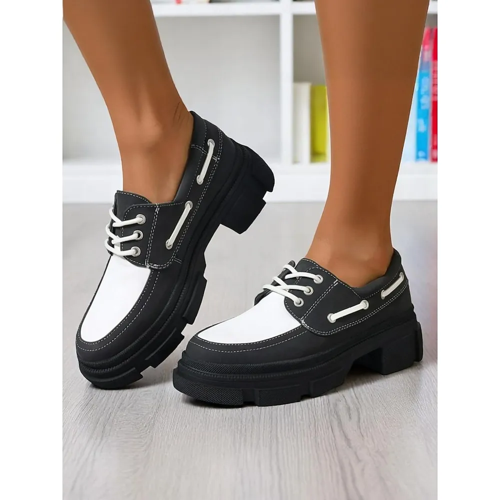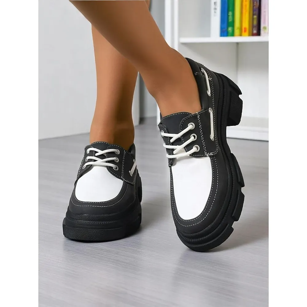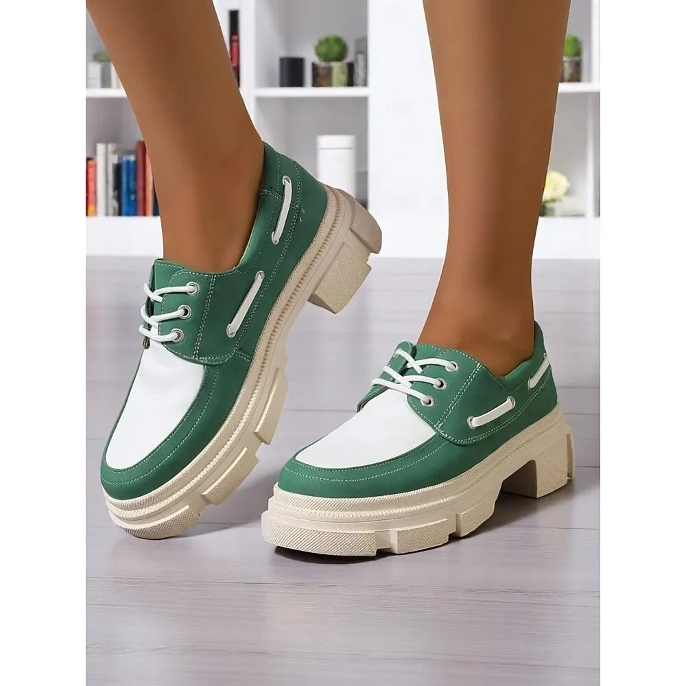 Women’s Oxford Style Platform Shoes – Trendy Green and White Color Block with Chunky Sole, Ideal for Commuter Wear and Casual Office Days