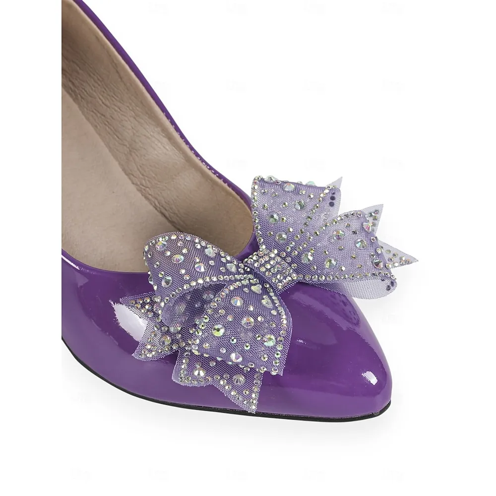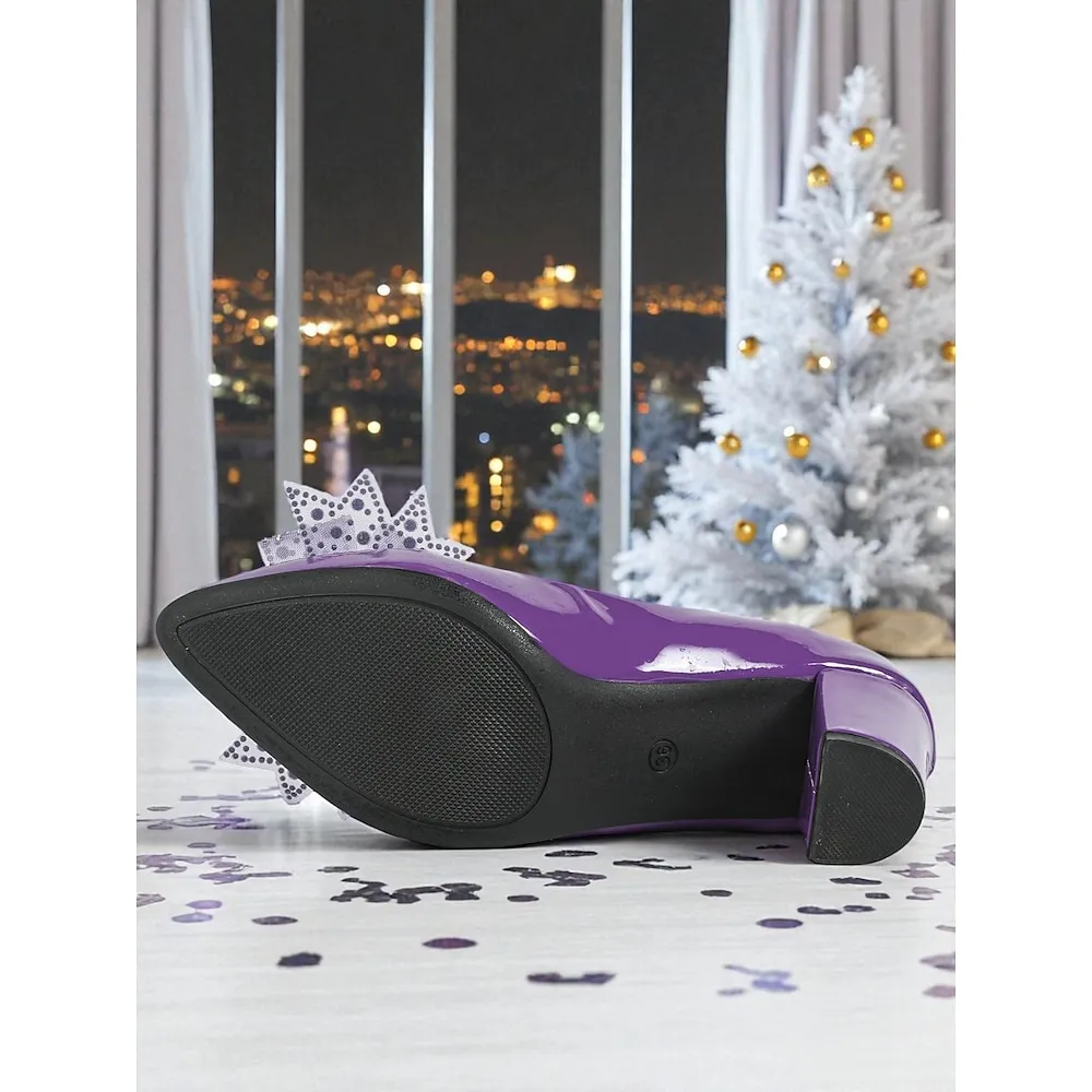 Women’s Purple Patent Leather Block Heel Pumps, Elegant Round Toe Dress Shoes with Bow for Formal Events & Office Wear