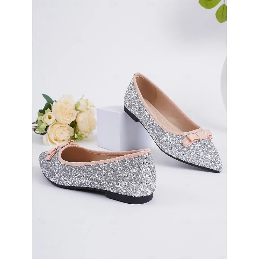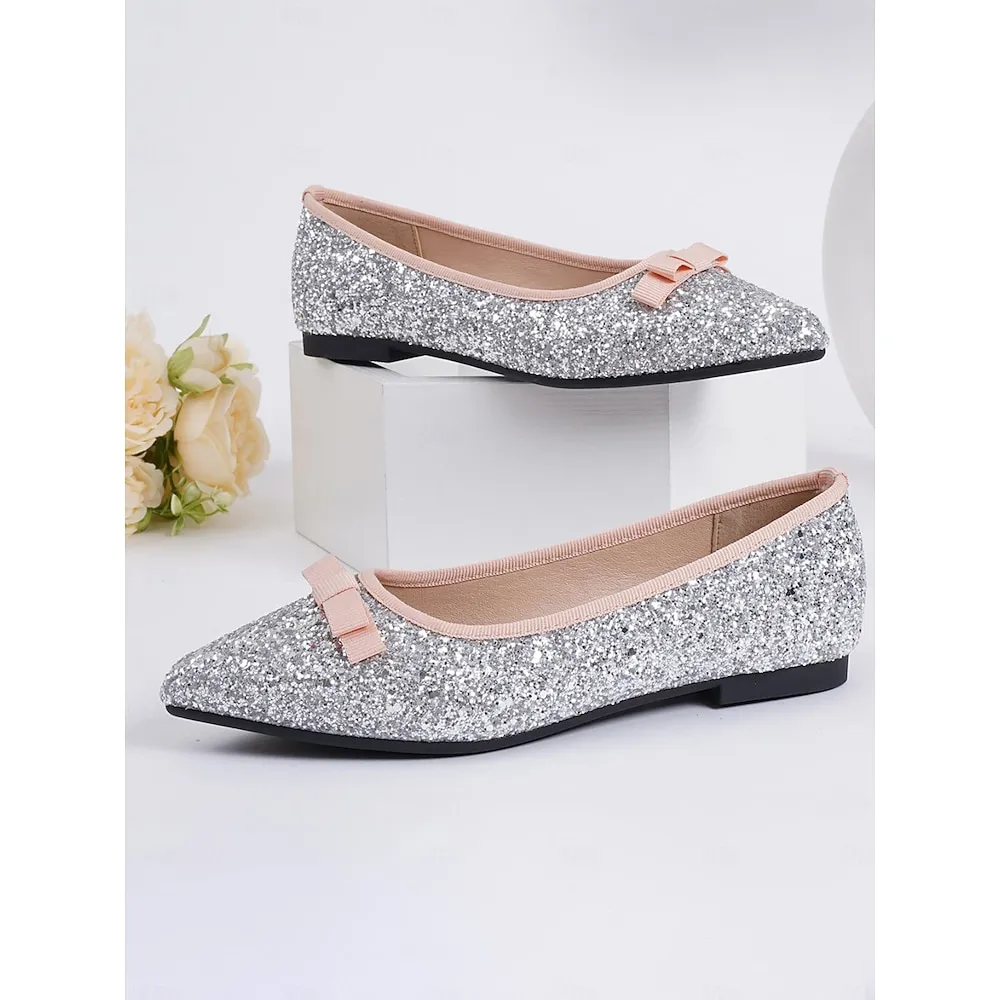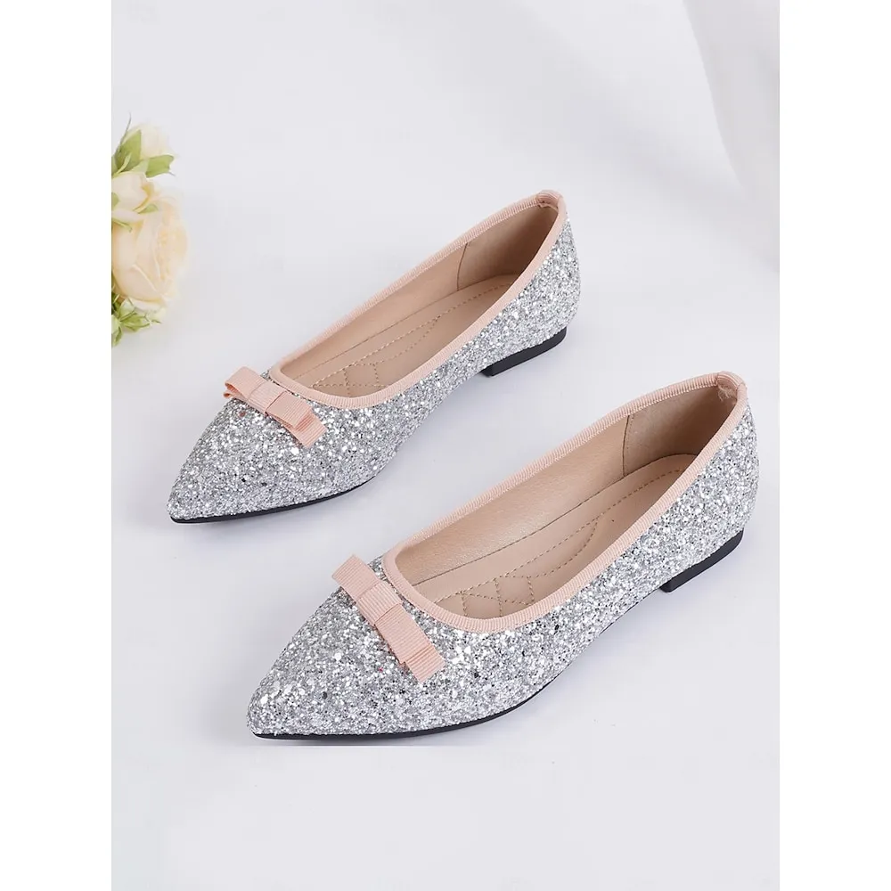 Women’s Silver Glitter Pointed Toe Flats with Bow Detail – Elegant Cocktail Party and Formal Occasion Shoes